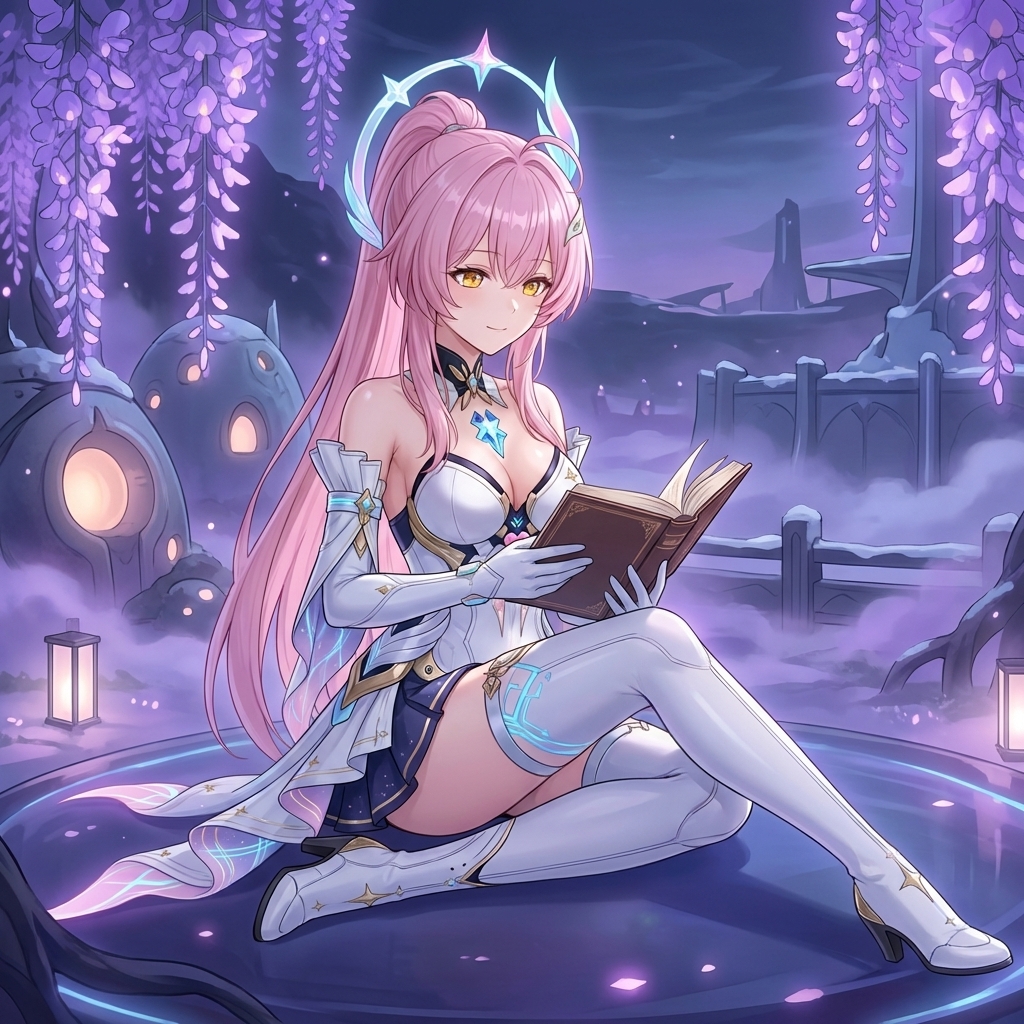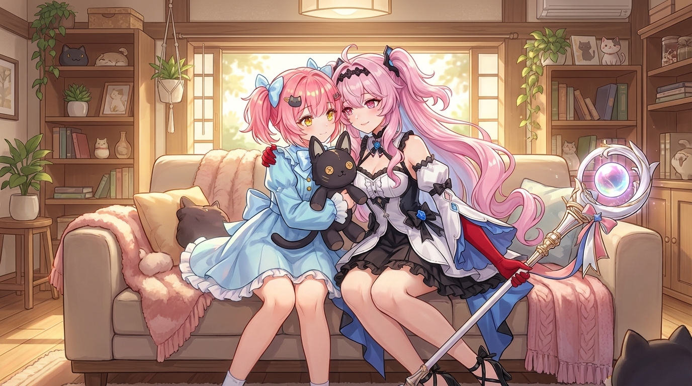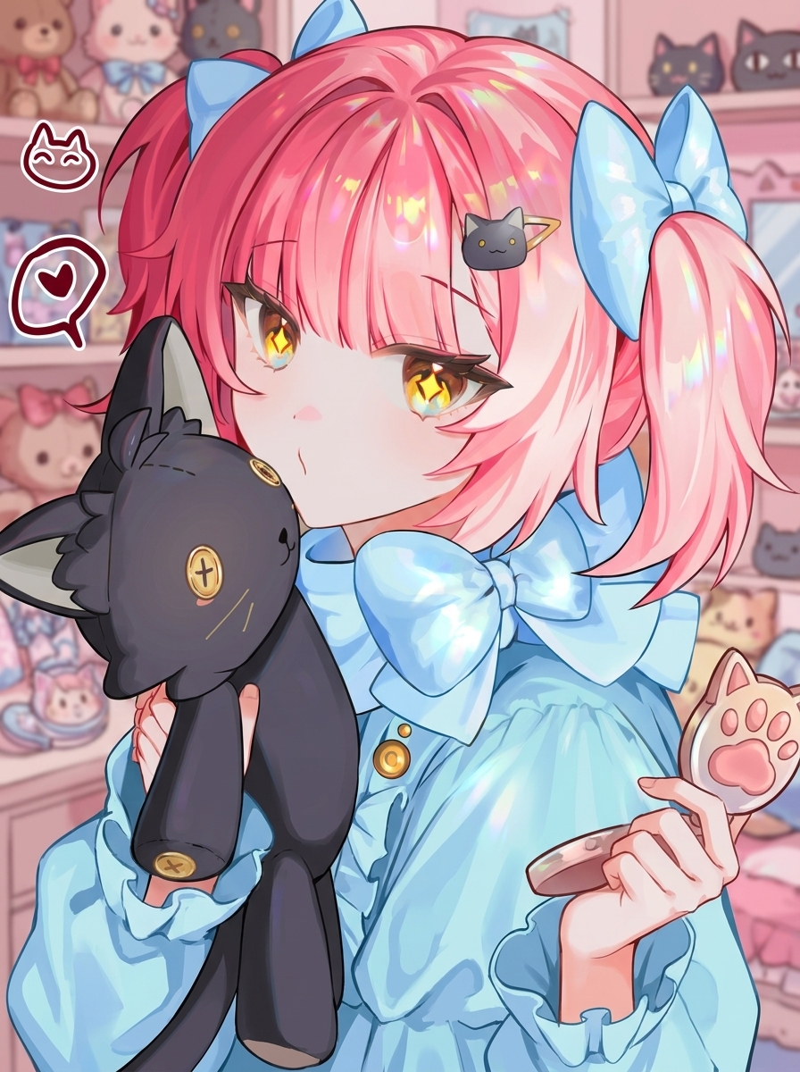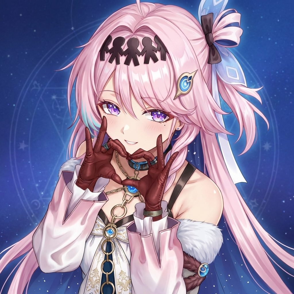 anime-inspired 3D render, pale pink with streaks of light blue long, wavy, with bangs and side braids, adorned with hair clips and feathered accessories hair, blue eyes, fair skin, slim, petite, wearing black and white gothic-lolita inspired dress with fur trim around the shoulders, a high blue collar with a jeweled pendant, chains across the chest, and a white skirt with black trim, with feathered hair accessories, blue collar with a crystal pendant, ornate chains, decorative headpiece resembling interconnected paper dolls or stick figures, unique headpiece resembling paper dolls or stick figures, striking blue and purple eyes, pale pink hair with colored streaks, detailed ornate jewelry and chains, color palette: pinks, blues, black, white, gold accents. A slim, petite young woman with long, wavy pale pink hair streaked with light blue. Her hair is styled with bangs and side braids, adorned with feathered accessories and a unique headpiece resembling interconnected paper dolls or stick figures. She has fair skin and striking blue eyes. She wears a black and white gothic-lolita inspired dress featuring fur trim around the shoulders, a high blue collar with a jeweled pendant, and ornate chains across the chest. Her accessories also include feather hair decorations and a blue spiked collar with a gem. 鸣潮|达妮娅, 穿着黑色小礼裙, 优雅地转身, 全身像, 略带仰视角度, 柔和的聚光灯打在身上, 背景有微弱的光晕, 营造一种神秘而迷人的氛围