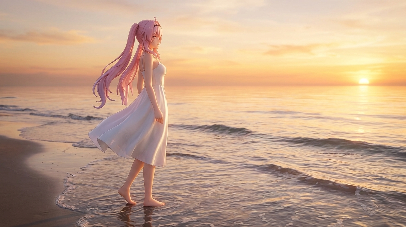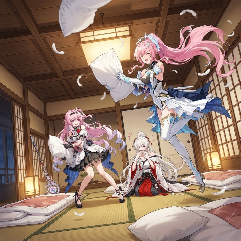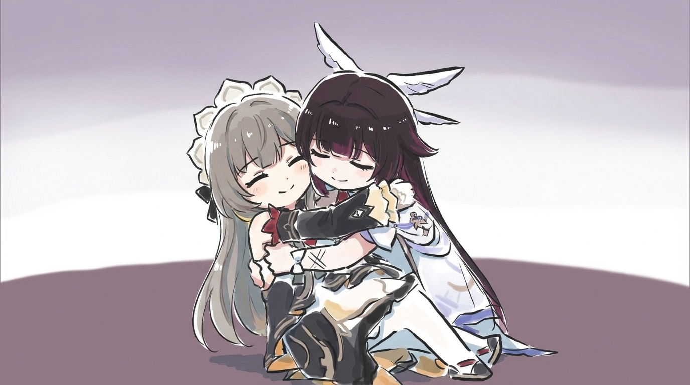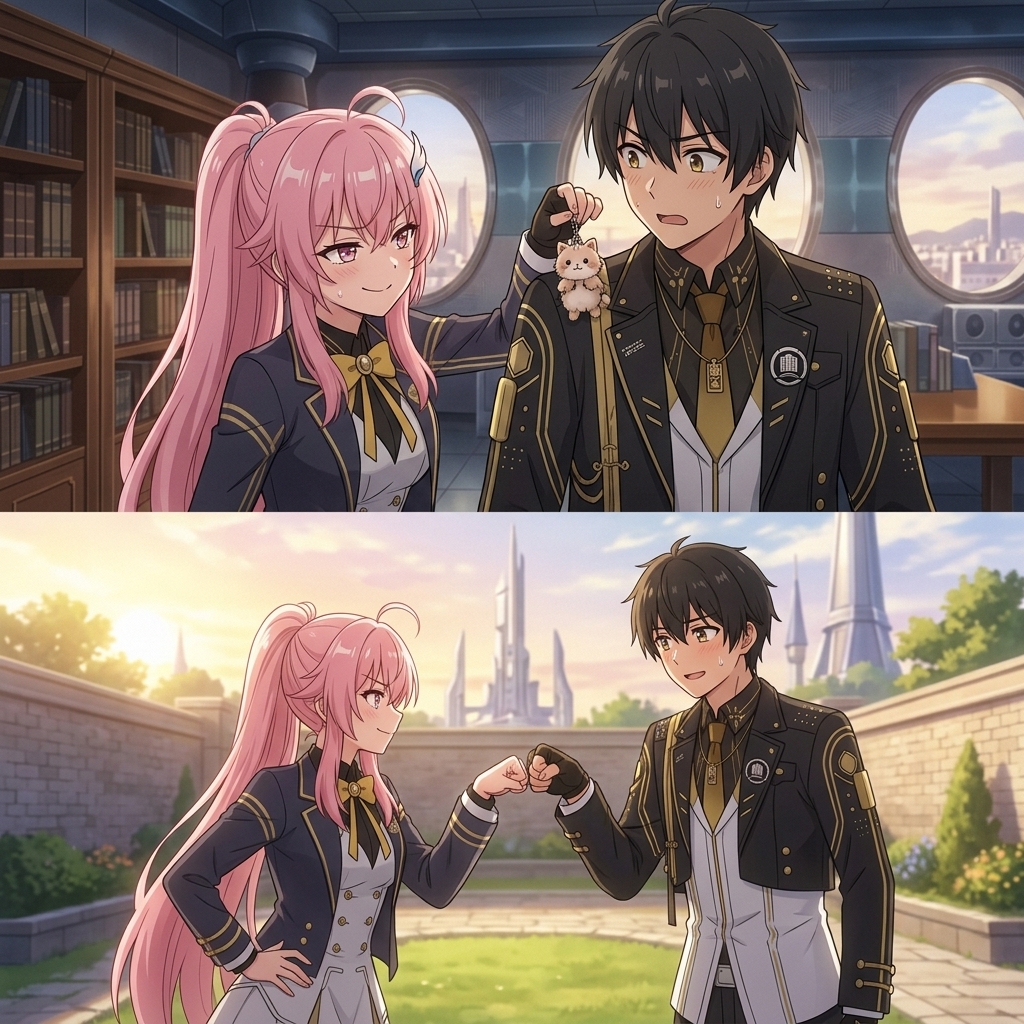 anime-inspired 3D render, pale pink with streaks of light blue long, wavy, with bangs and side braids, adorned with hair clips and feathered accessories hair, blue eyes, fair skin, slim, petite, wearing black and white gothic-lolita inspired dress with fur trim around the shoulders, a high blue collar with a jeweled pendant, chains across the chest, and a white skirt with black trim, with feathered hair accessories, blue collar with a crystal pendant, ornate chains, decorative headpiece resembling interconnected paper dolls or stick figures, unique headpiece resembling paper dolls or stick figures, striking blue and purple eyes, pale pink hair with colored streaks, detailed ornate jewelry and chains, color palette: pinks, blues, black, white, gold accents. A slim, petite young woman with long, wavy pale pink hair streaked with light blue. Her hair is styled with bangs and side braids, adorned with feathered accessories and a unique headpiece resembling interconnected paper dolls or stick figures. She has fair skin and striking blue eyes. She wears a black and white gothic-lolita inspired dress featuring fur trim around the shoulders, a high blue collar with a jeweled pendant, and ornate chains across the chest. Her accessories also include feather hair decorations and a blue spiked collar with a gem. 鸣潮|达妮娅, 穿着黑色小礼裙, 优雅地转身, 全身像, 略带仰视角度, 柔和的聚光灯打在身上, 背景有微弱的光晕, 营造一种神秘而迷人的氛围